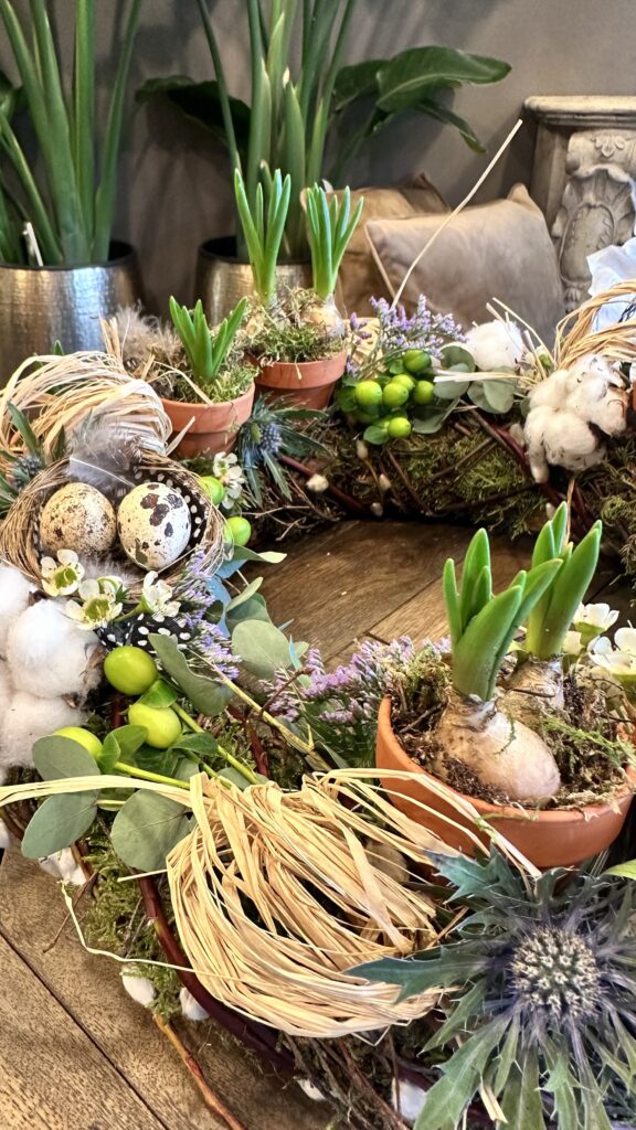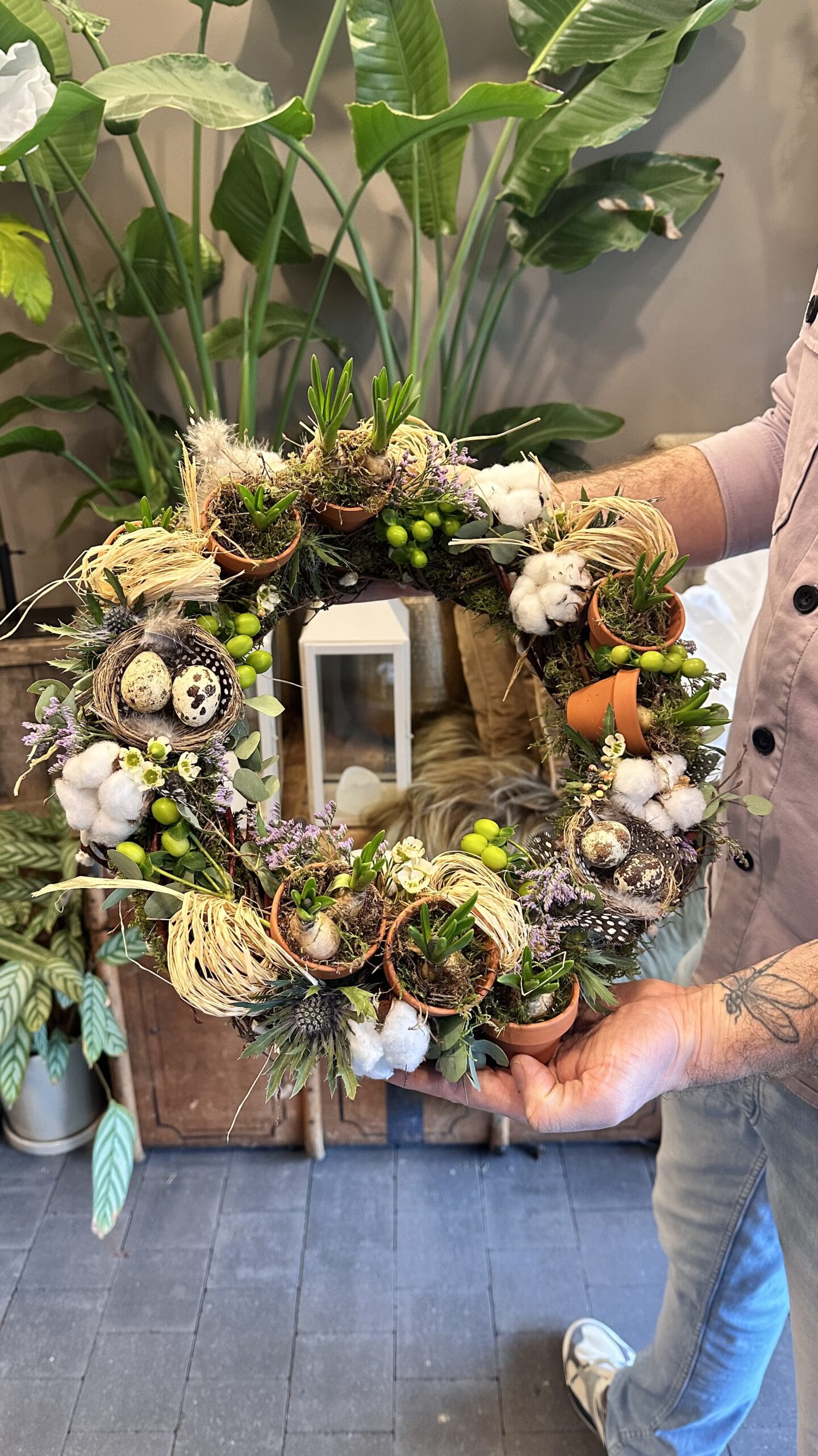 Tijdens deze workshop gaan we aan de slag met verse bloemen en allerlei leuke voorjaarsmaterialen: denk aan knolletjes, eitjes, takjes en alles wat met Pasen te maken heeft. We maken dit keer een prachtige paaskrans van 40 cm doorsnede die helemaal past bij het seizoen én natuurlijk schittert op tafel of aan de deur.