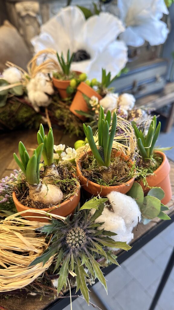 We werken met materialen die heel lang mooi blijven en prachtig indrogen. De knolletjes verwerken we in kleine potjes, zodat je ze na de bloei heel gemakkelijk kunt vervangen. Zo geniet je extra lang van jouw creatie!
